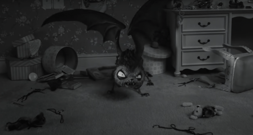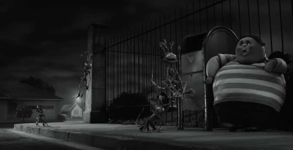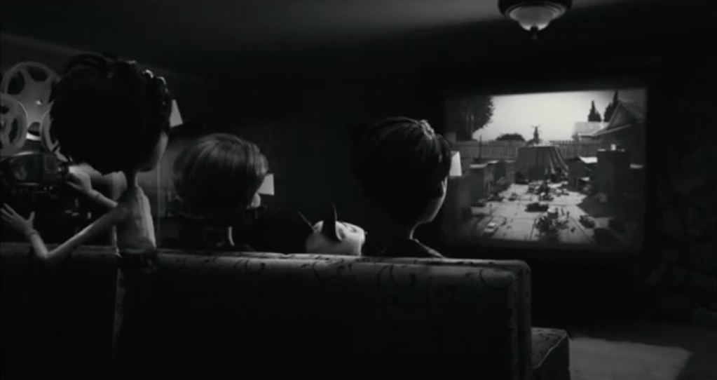 Although Edward Scissorhands focuses more on Frankenstein’s monster than the mad scientist himself, it still shows a crucial motif within Burton’s films wherein the mad scientist, or creator, is not afraid of their creations, but rather injected with the same spirit as them, and thus, they become one. This is realised through Burton’s later retelling of Frankenstein, Frankenweenie; a 2012 stop motion film inspired by Burton’s own live action film of the same name from 1984. Thus, Frankenweenie shows a similar pattern of self-referential Gothic as Edward Scissorhands; yet, Frankenweenie updates this model into a Gothic tale for children, dealing with similar themes of grief and isolation at a more childlike level. Rather than following the creature, Frankenweenie is more faithful to its original story as it follows the young Victor Frankenstein; an outsider interested in science, who resurrects his pet dog Sparky after he is hit by a car. Victor, like Vincent and Edward, is portrayed as somewhat of an outsider, which allows him to mould into the stereotype of mad scientist; for example, he would rather spend time at home with his dog than with his peers, interested more in science than socialisation. This is furthered through Edwards creative interest in filmmaking, which is seen from the opening of the film: the first scene is of a homemade film, ‘Monsters From Beyond’,[18] which immediately sets the tone of the film. The scene begins with this title card before zooming out to reveal Victor and his family watching the film, as seen in fig. 5.[19] This shot establishes that it is not only Victor’s own film that is in black and white, but also Frankenweenie, immediately suggesting an overt Gothic tone, which is used to remind viewers of classic Gothic tales from which Frankenweenie is inspired by. The act of movie-watching is also essential to the narrative of Frankenweenie, as the film is highly meta-textual of both Frankenstein and the classic monster movies inspired by such Gothic fiction. Frankenweenie is thus instantly marked as an example of Postmodern Gothic within its opening scene.