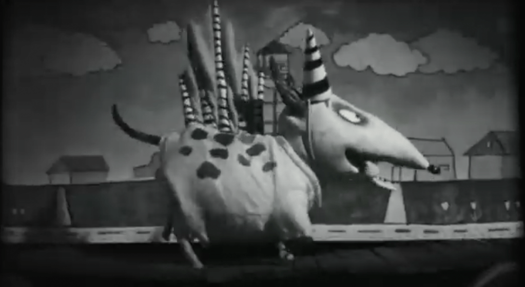 In fig. 6,[20] we see that Sparky is involved within Victor’s film, playing ‘sparkysaurus’, saving the day from the monster attack occurring. This crucially foreshadows Sparky’s role within the narrative, as he does indeed become a kind of hybridised monster like in Victor’s film. However, unlike his Frankenstein counterpart, we will go on to discuss how Sparky is in fact the hero of the story, allowing for a redemption of the tragic creature through love and care. Like Vincent from the short film of the same name, Victor in Frankenweenie can be read as an allegory for Burton himself, with him sharing a love of filmmaking and the macabre with the director. This is especially considered by Chris Louttit who states that ‘Burton grew up absorbed in a world of monster movies and B-pictures, experiencing these either at home on TV or in ‘weird triple bills’ at neighbourhood theatres in Burbank.’[21] Therefore, Burton’s intertextual meshing to create a Postmodern Gothic is prevalent, as he draws inspiration from the classic monster movie while directly referencing them in an attempt to pay homage. Thus, Burton continues to suggest the role of the outsider as a creative one, utilising their interest for good rather than evil. There is therefore the implication that the mad scientist is not immoral, but misunderstood; as Louttit further recognises about the mad scientists and creatures within these stories, ‘Burton always shows a great interest in their plight, and, it might even be suggested, identifies with them as a fellow ‘outsider’.’[22] Burton is thus interested in aligning audience sympathies with those who they are meant to fear, in an attempt to understand those labelled as ‘different’.