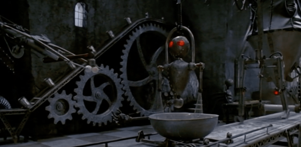 Vincent therefore provides a clear lens as to the development of the creator within Edward Scissorhands. In a flashback scene where Price is introduced, we see a large baking machine (fig. 3);[13] it is mechanical and wholly unnatural, with the robots being formed like people. Yet, unlike the stereotypical trope where the mad scientist is uncaring and afraid of his creation, as is the case with Frankenstein, Price’s creator picks up a heart shaped biscuit, and holds it up to one of the robots, as seen in fig. 4.[14] There is the implication that Price’s creator is not immoral nor imbued with hubris; rather, his creation comes from a place of love. This is where Burton transforms Frankenstein; although we are encouraged to be somewhat sympathetic towards the creature, Frankenstein is portrayed in a more villainous nature, as it is his abandonment of his creation that leads to tragedy. Yet, here the creator is the opposite, being a loving and caring father figure towards Edward. Thus, when Edward is found by Peg, he is not grieving an abandoned father, but a dead one, and his pain does not turn him into a vengeful monster, but rather it makes him more human.