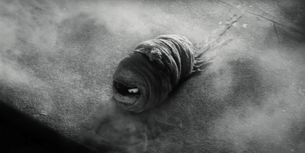 As previously discussed, the mad scientist trope is often employed as a warning against the dangers of science gone wrong; a theme which is prevalent within Frankenweenie, however is subverted through a Postmodern lens to suggest it is not science itself that is the danger, but the intention behind such. Victor’s classmates learn of Sparky’s re-animation, and in an attempt to try and beat him at the science fair, they begin to re-animate their own pets as well, to disastrous consequences. The re-animated pets begin to attack the town’s funfair, taking on various roles of classic Gothic and Science Fiction; for example, the gremlin sea monkeys (fig. 7),[23] the bat which becomes fused with Sparky’s nemesis cat in order to create a vampiric feline (fig. 8),[24] and the mummified hamster (fig. 9).[25] These monsters are intertextual references to the famous Hammer horror monster movies made between the 1950s and 1970s, which were retellings of Gothic tales such as Frankenstein and Bram Stoker’s Dracula. Referring back to the opening scene, the narrative transforms into one of Victor’s homemade movies, suggesting that it is he who understands this world and will thus have to be the one who saves it. It is Victor’s inherent ‘weirdness’ that allows him to overcome disaster, and rather than become the villain, helps to save the town alongside Sparky in a scene which reimagines Frankenstein’s own climax.